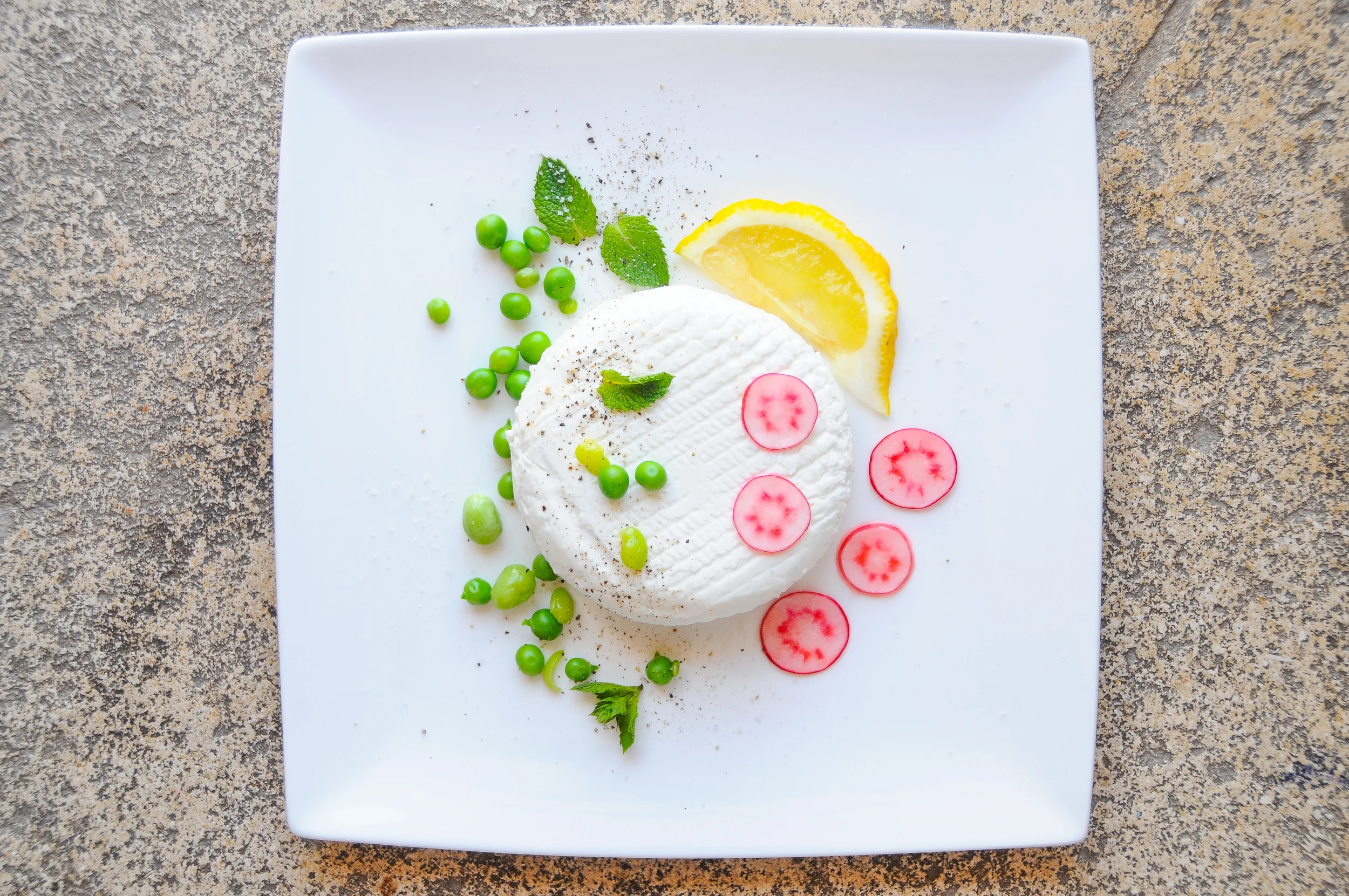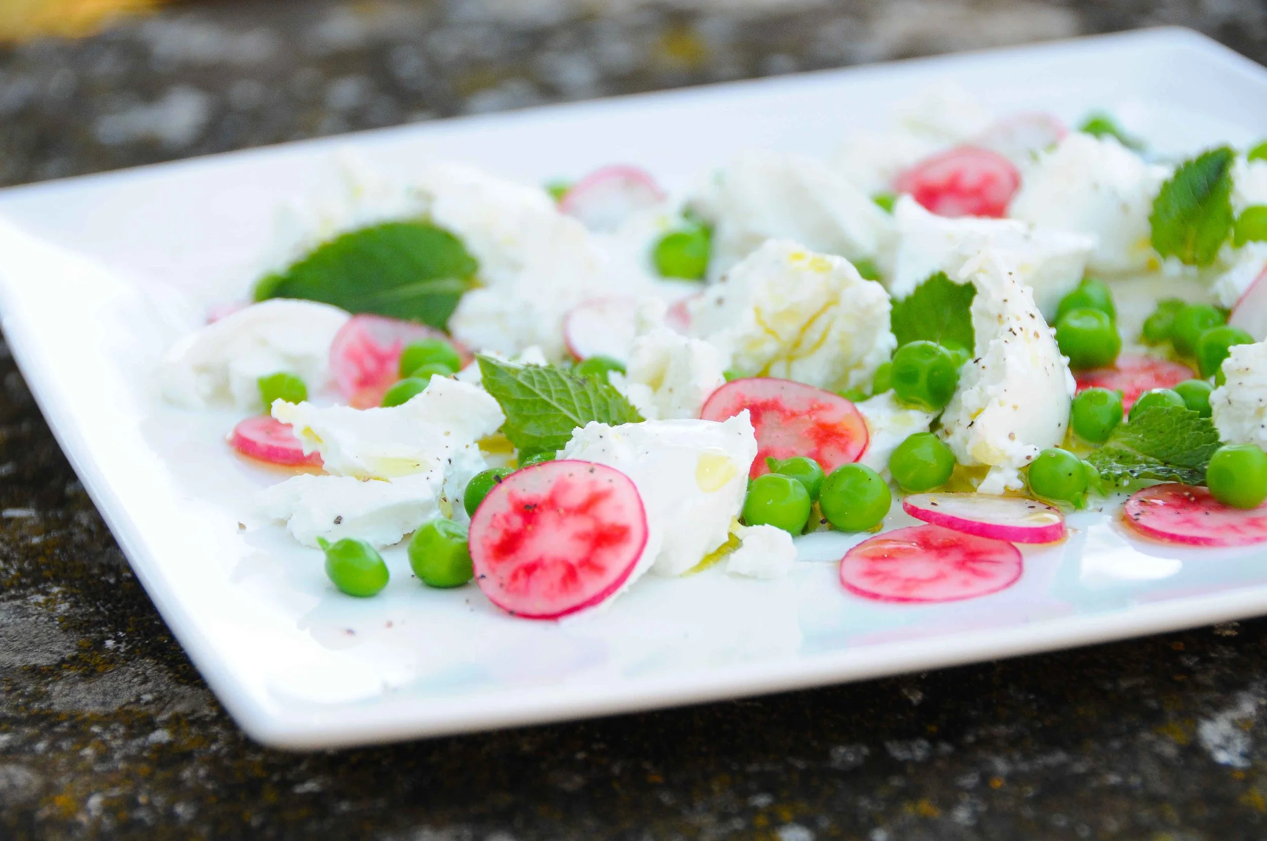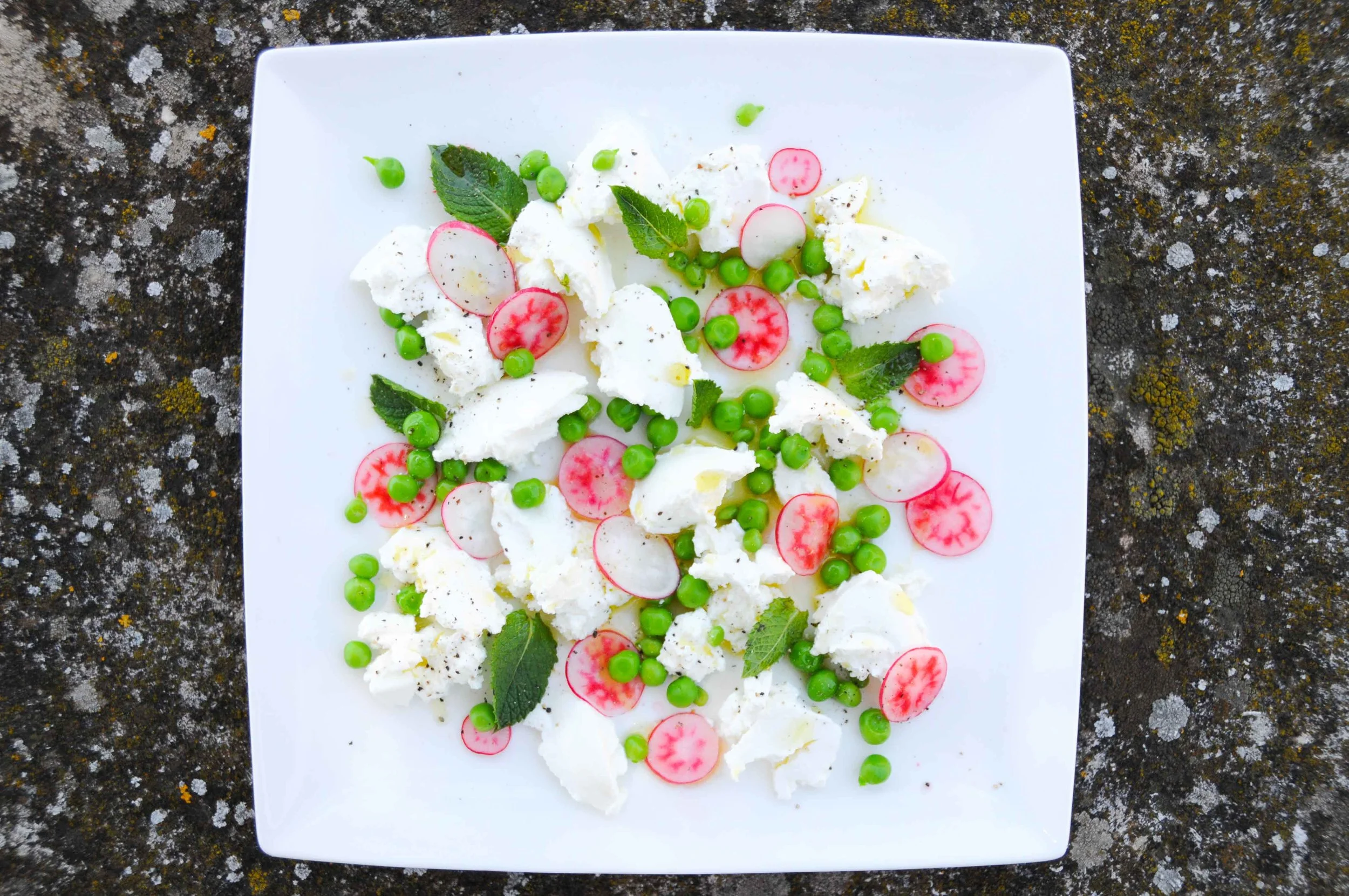 To assemble, place the whole round of goat curd centrally on your serving plate, and then scatter the peas, radish slices, whole mint leaves, and lemon zest down one side of the dish, partially covering the cheese. Or, alternatively, separate the curd into small chunks and scatter these across your platter, interspersed with the radishes, peas, mint, and zest.