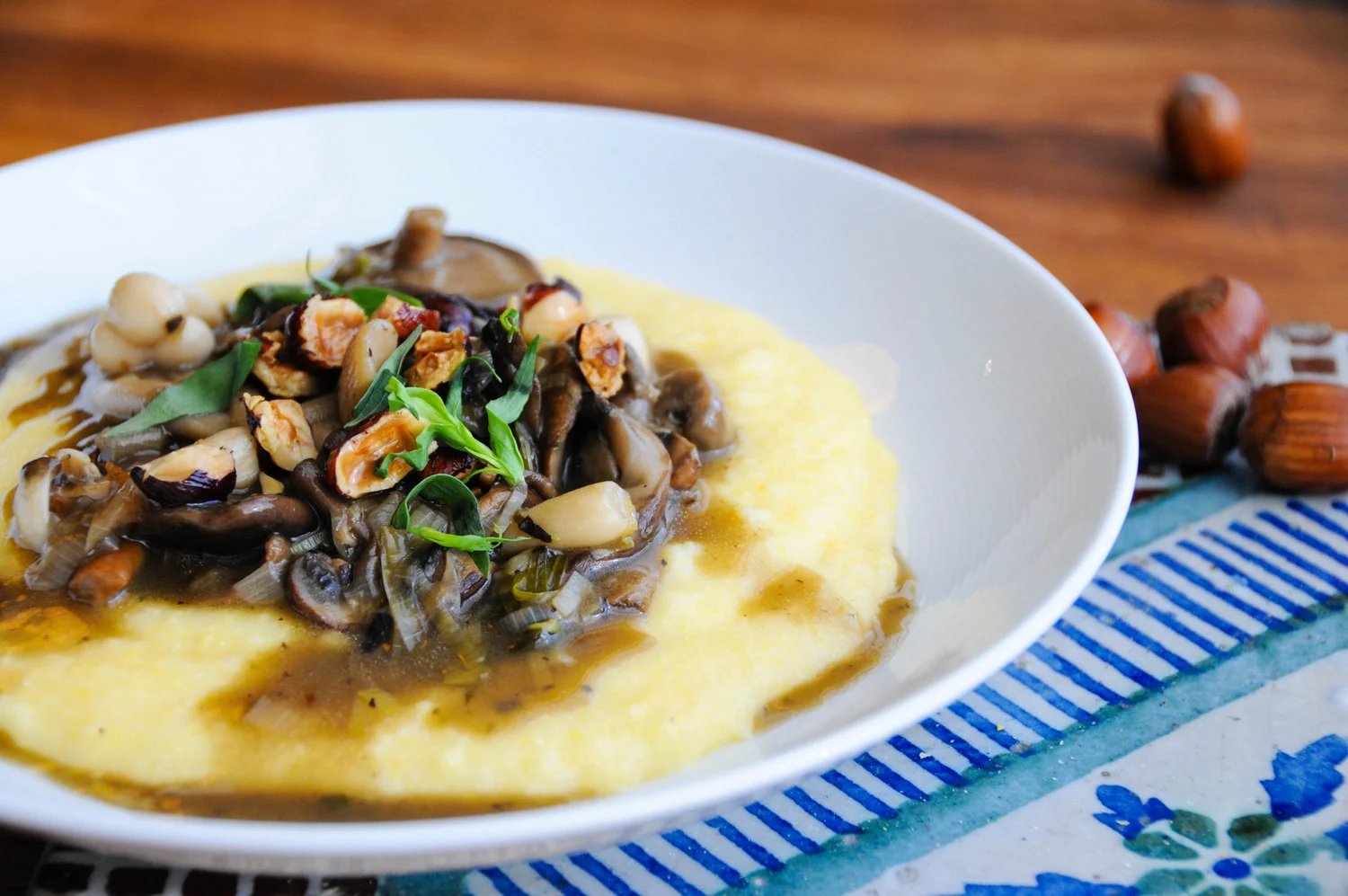 To finish the polenta, stir through the butter and grated parmesan. Using a large serving spoon, dollop the polenta onto warmed plates, swirling with the back of the spoon to make a well in the centre of each. Pile the mushroom mixture into this well, and scatter the roasted hazelnuts on top…