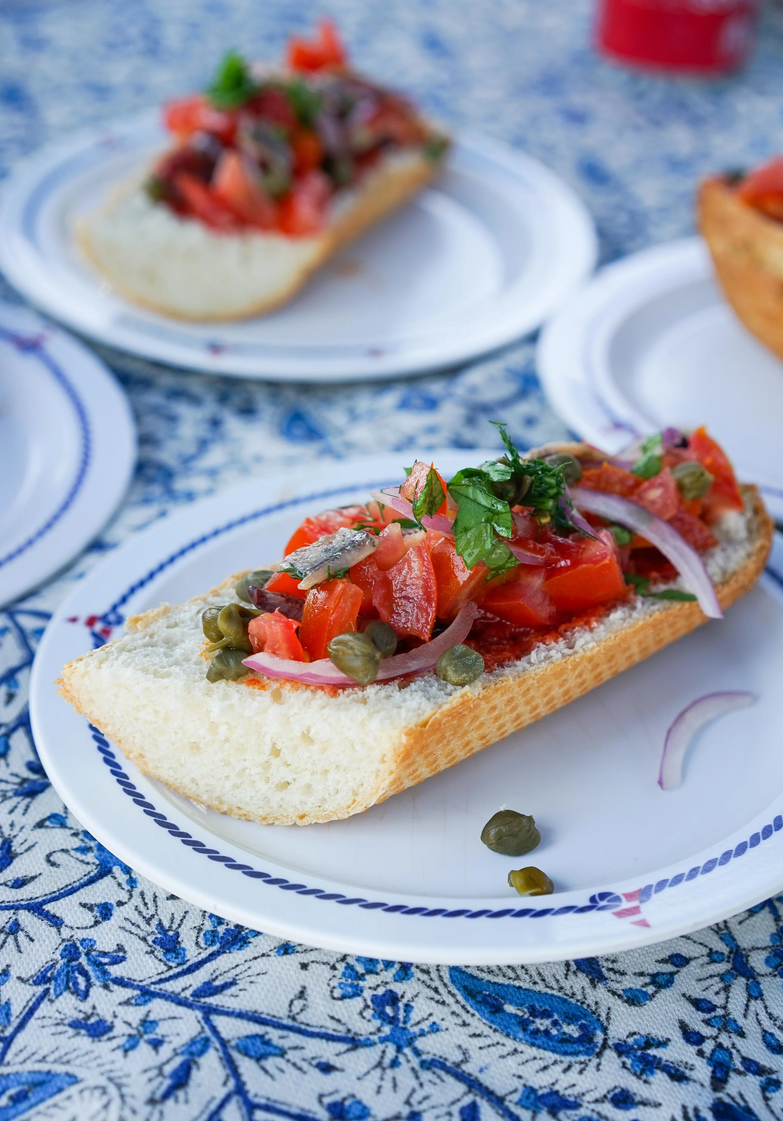 Not wanting to waste non-perishables (but also disinclined to pack them all back into the bag!) more than a few lunches afloat were of Hobz biz-Zeit, or what I call Maltese Crazy Bread. It wasn’t always so crazy. The version our Maltese grandmother served up when we were kids was a lot less crowded, just the chopped olives, tomato paste, and olive oil base really. I’d heard that there were some ‘crazier’ variations about though, and with a ton of anchovies and capers to use up, as well as fresh tomatoes, onions, and herbs (from the definitely-no-shortage-of-food Greek markets), the temptation was to get as crazy, piled-high, and salty as possible!