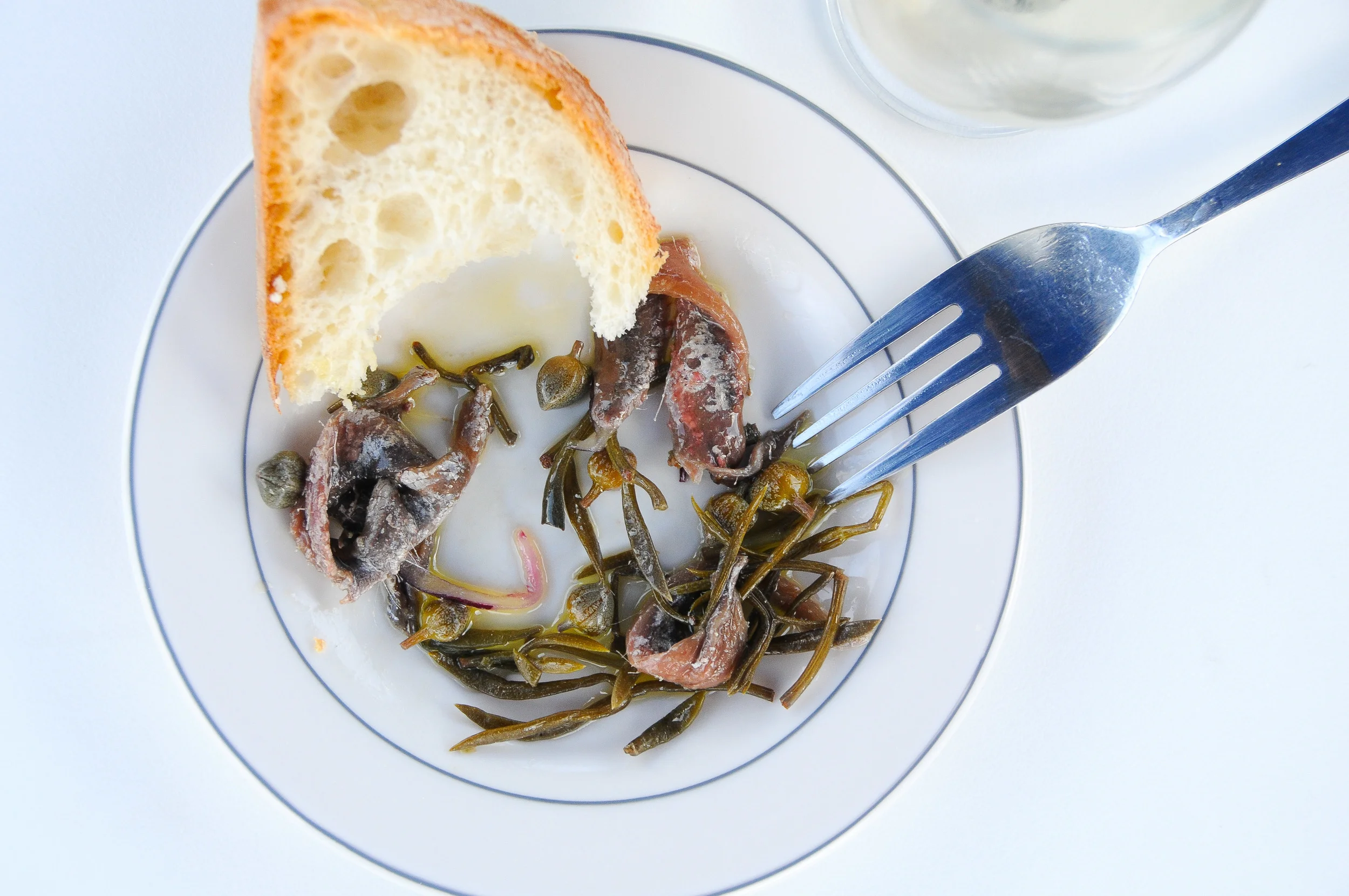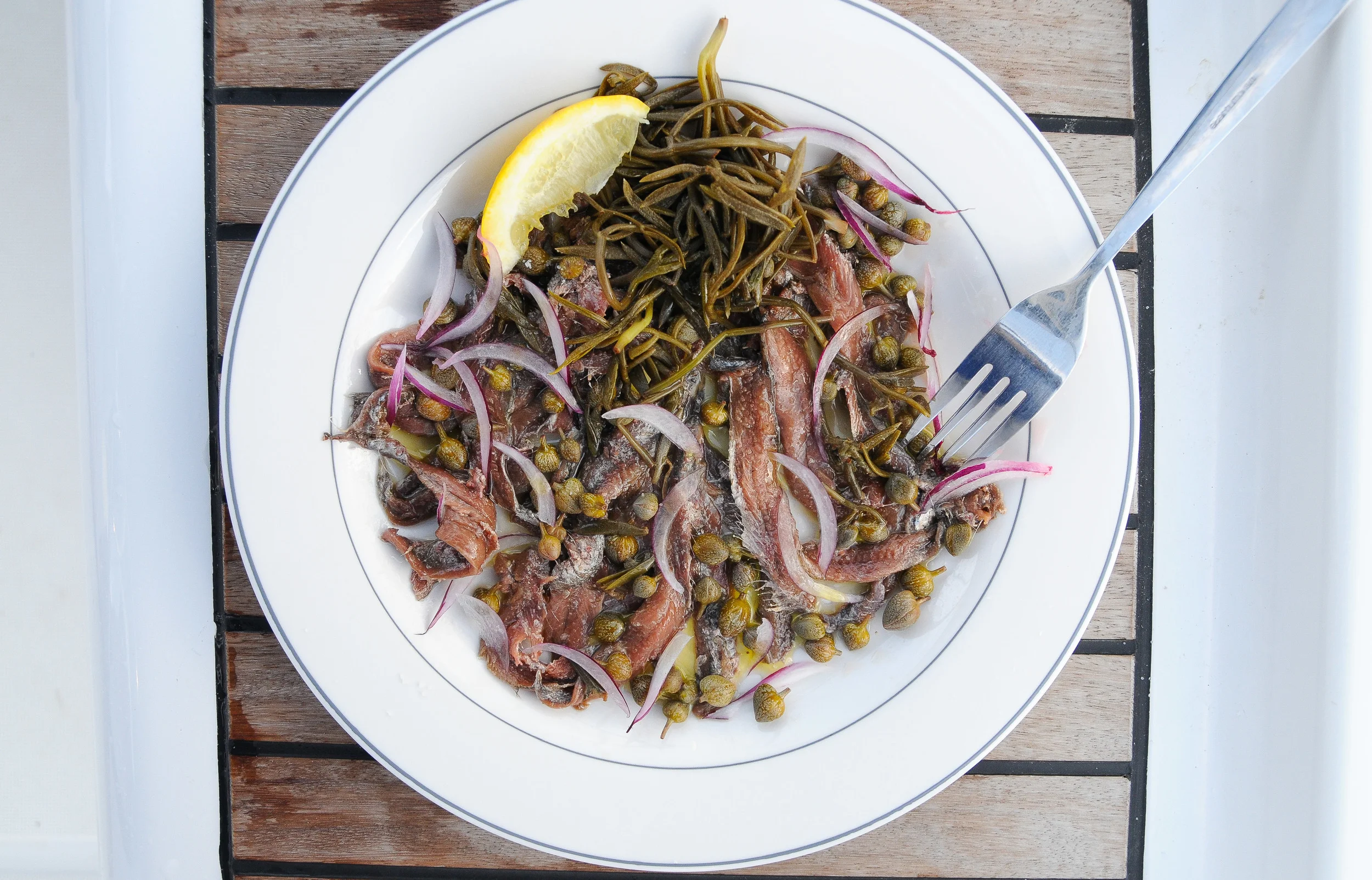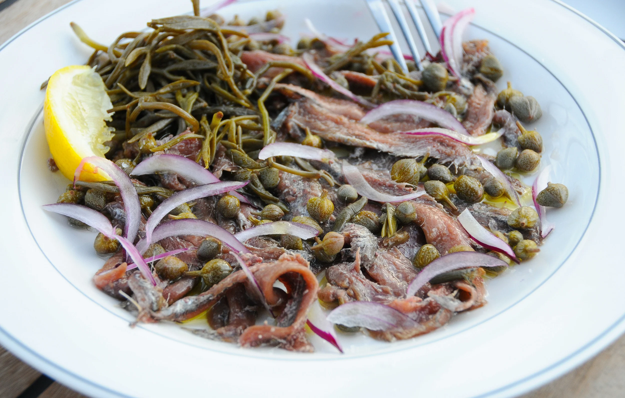Pickled capers and rock samphire are combined with anchovies to make this delicious salty salad – it's kind of sea-side Dalmatia on a plate. Of course, on Vis, the Croatian island that inspired this dish, they preserve their own anchovies, but I am going to let that one slide here. Six weeks of curing fish in a bucket under a heavy set of weights was more than my apartment could be expected to reasonably withstand… and I am guessing that it’s maybe more than yours might either!